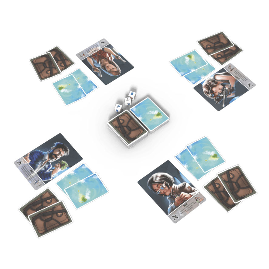 Entrando en más detalle, cada jugador recibe al azar una hoja de personaje (cada uno con un poder especial diferente), junto con una carta inicial, una carta de acción y dos cartas de dinero. Entre las cartas iniciales hay entre 2 y 5 paracaídas (dependiendo del número de jugadores), y querrás conseguir uno de ellos para sobrevivir al final de la partida. Se utilizan tantos dados como el número de jugadores menos uno. Se elige un jugador inicial al azar. Este jugador lanza todos los dados, usa uno de ellos (robando una carta de acción o de dinero, robando una carta de acción o de dinero a un oponente, o usando su poder especial) y, a continuación, elige al siguiente jugador que realizará un turno. Una vez que se han usado todos los dados, el jugador que no haya podido utilizar ninguno se convierte en el jugador inicial de la siguiente ronda.
