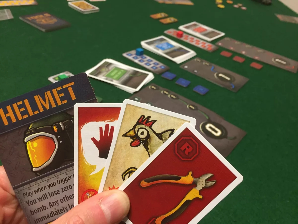 Después de revelar las acciones, los cables elegidos se “cortan” volteando cartas de los mazos correspondientes. El valor de cada carta determina hasta dónde se mueve el disparador en la pista y cuántos puntos se ganan; cortar cables por tu cuenta vale mucho más que cortar el mismo cable que otros jugadores. ¡Si se empuja demasiado el disparador, la bomba explotará! Quien haga que la bomba explote pierde puntos.