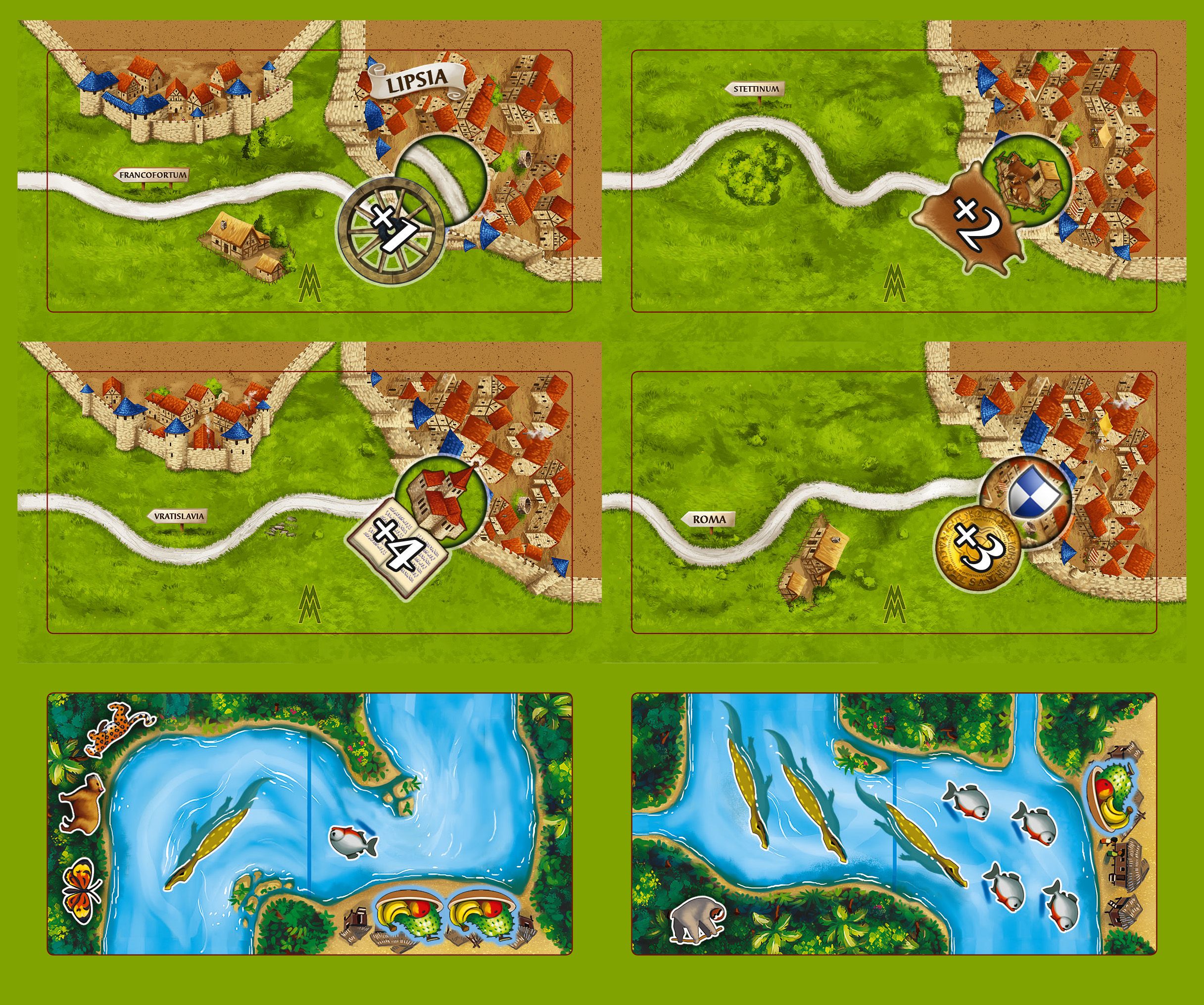 Además, la expansión incluye dos losetas dobles de paisaje para Carcassonne: Amazonas.