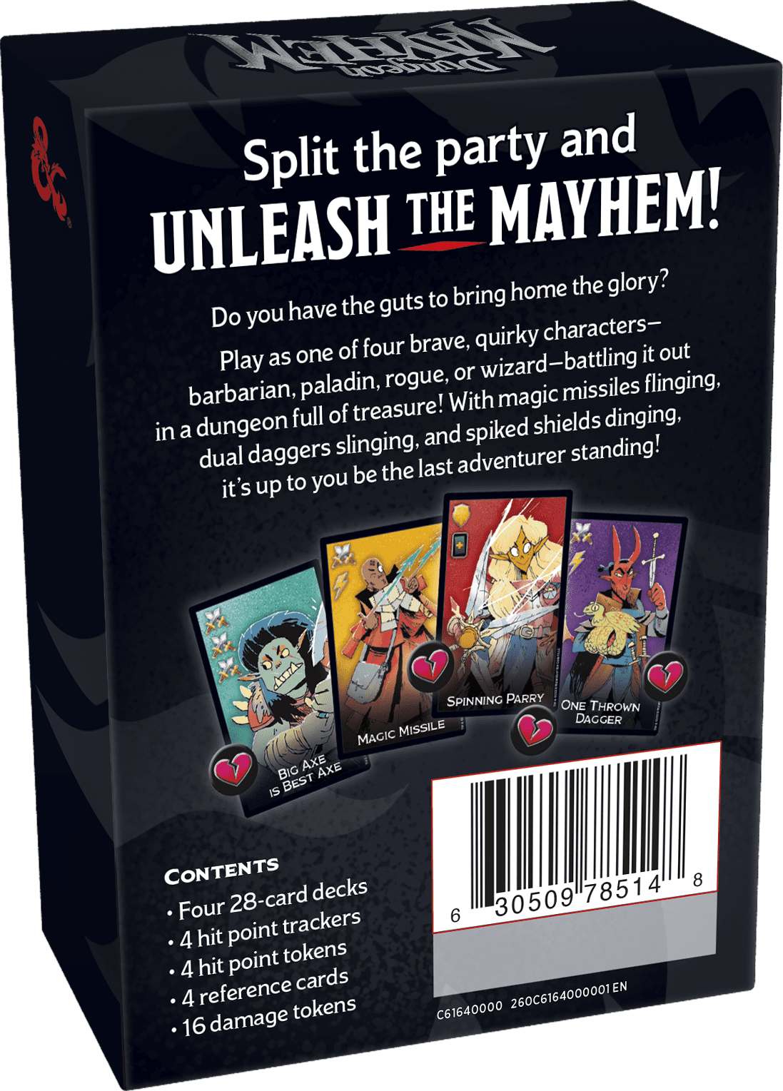Las ilustraciones de Kyle Ferrin en los cuatro mazos de cartas representan a Sutha el Destructor de Cráneos (bárbaro), Azzan el Místico (mago), Lia la Radiante (paladín) y Oriax el Astuto (pícaro). Elige uno de estos personajes y juega sus poderosas cartas, como el Toque Vampírico de Azzan para intercambiar puntos de vida con un oponente, o los Hachas Giratorias de Sutha para curarte mientras infliges un daño aplastante al resto del grupo.