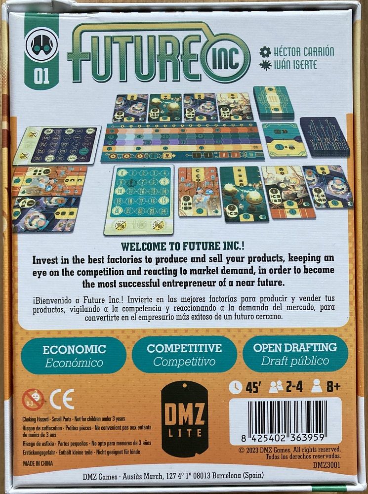 Future Inc. es un juego de cartas económico que se juega a lo largo de cinco rondas, cada una dividida en tres fases de acción y una fase de mercado.